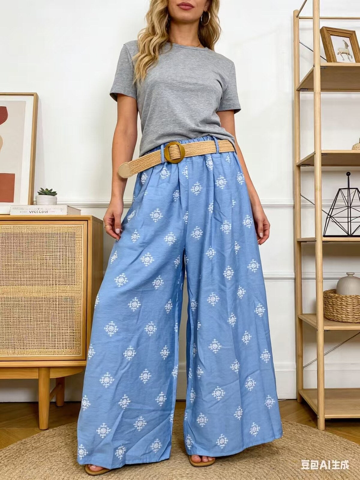 Bukser i en blød og let viskosekvalitet med et dekorativt all-over print. Bukserne har en løs pasform med brede ben, og en høj talje med bælte